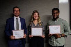 About the photo: 3 winners of 2025 3MT Competition: left to right: Zachary McAllister (CEMS); Sarah Ziemann (CEGE); Ebuka Ezugwu (ME, MRSEC).